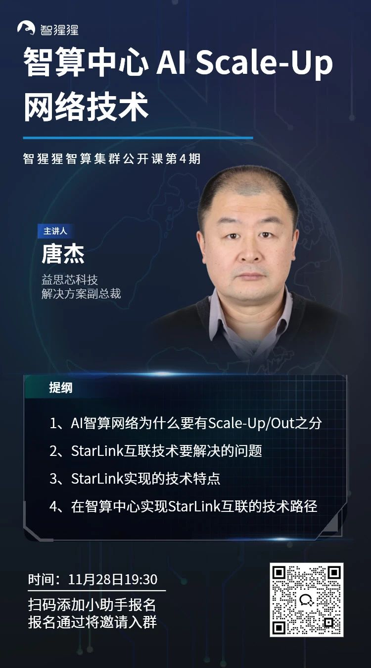 11月28日19:30,「智猩猩智算集群公开课」第4期将开讲,由益思芯科技解决方案副总裁唐杰主讲,主题为《智算中心 AI Scale-Up 网络技术》。