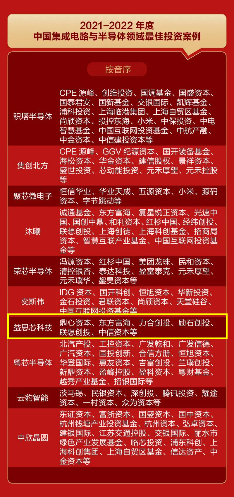 8月18日,2022(第八届)中国产业投资峰会上,融资中国发布“2021-2022年度中国产业投资榜”。凭借在DPU芯片领域的良好发展,益思芯科技荣获“2021-2022年度中国集成电路与半导领域最佳投资案例”奖项。