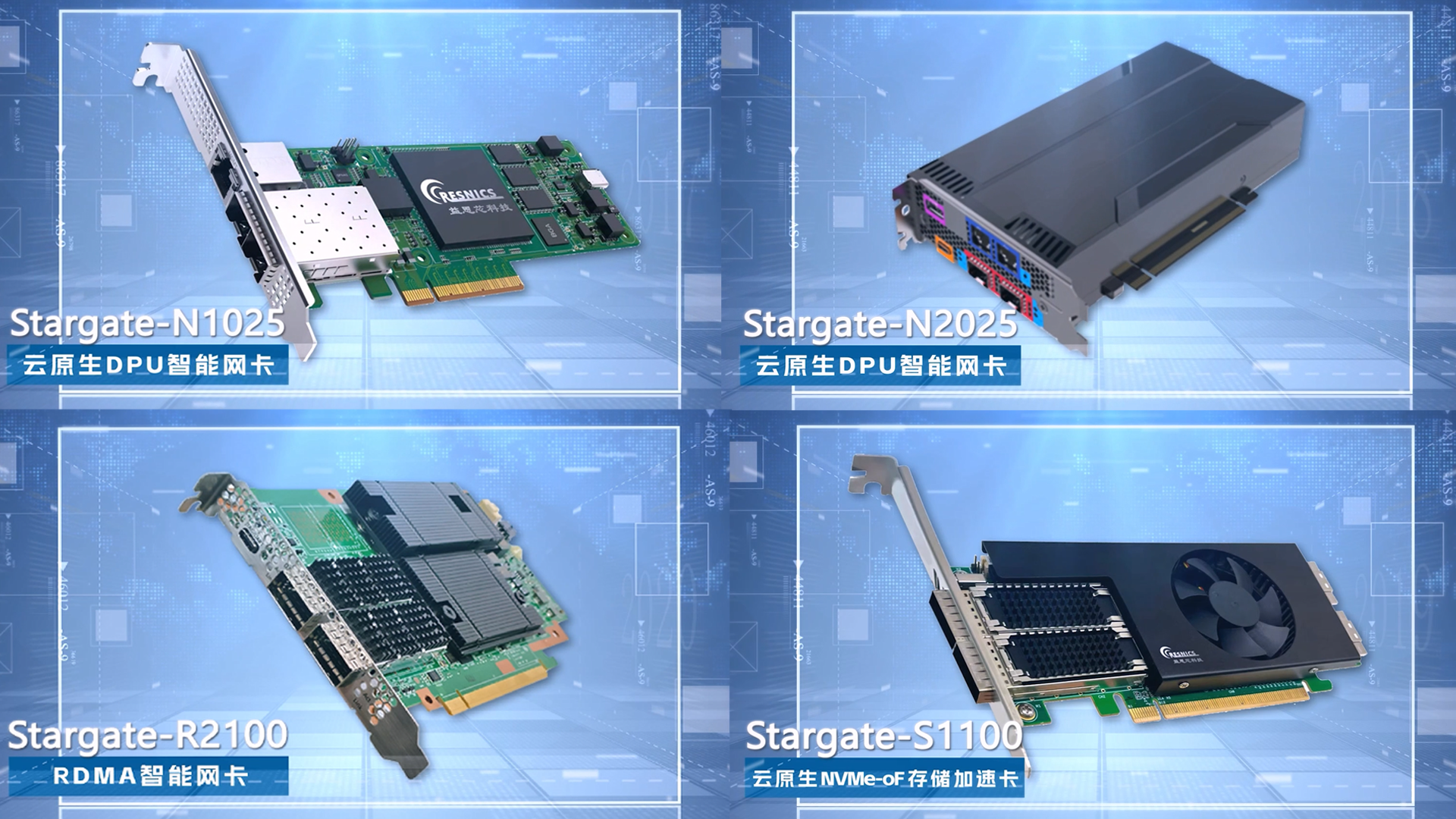 益思芯科技展示了 Stargate-N1025 以及升级款 Stargate-N2025 DPU 智能网卡、Stargate-R2100 RDMA 智能网卡和 Stargate-S1100 NVMe-oF 存储加速卡四款重磅产品,它们都具备了高性能、低延迟、低功耗、高灵活性等特点,全方面解决了智算中心高性能数据传输的需求。